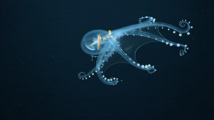 1. Bạch tuộc thủy tinh: Giống như những sinh vật thủy tinh khác, chẳng hạn như ếch thủy tinh và sứa lược, bạch tuộc thủy tinh gần như hoàn toàn trong suốt, chỉ có đôi mắt, dây thần kinh thị giác và ống tiêu hóa là hiện rõ.
