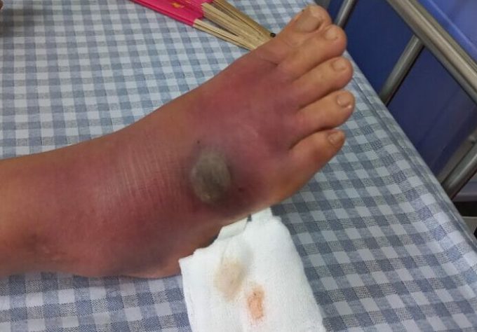 Hình ảnh mu bàn chân sưng tấy, vết chuột cắn có dấu hiệu hoại tử. Ảnh: Bệnh viện cung cấp