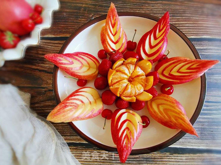 Sau khi cắt xong, xếp các miếng táo lên đĩa, lột vỏ quýt đặt ở giữa là hoàn thành.