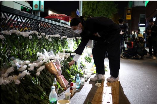 Người dân đặt hoa tại gần hiện trường vụ giẫm đạp trong lễ Halloween ở Seoul. Ảnh: Reuters.