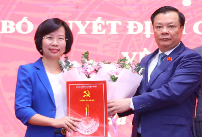 Bí thư Thành ủy Hà Nội Đinh Tiến Dũng trao quyết định điều động, phân công bà Bùi Huyền Mai làm Bí thư quận ủy Thanh Xuân. Ảnh: Văn Điệp