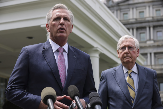 Lãnh đạo phe thiểu số tại Hạ viện Kevin McCarthy (trái) và lãnh đạo phe thiểu số tại Thượng viện Mitch McConnell phát biểu sau cuộc gặp với Tổng thống Joe Biden tại Nhà Trắng ngày 12/5/2021. Ảnh: Reuters.