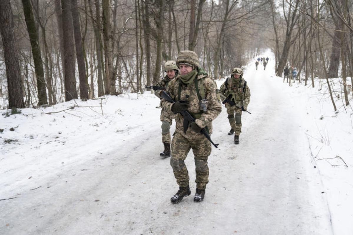 Các tình nguyện viên của Lực lượng Phòng vệ Lãnh thổ Ukraine đi qua một con đường phủ đầy tuyết trắng ở ngoại ô Kiev hồi đầu tháng 2. Ảnh: Washington Post