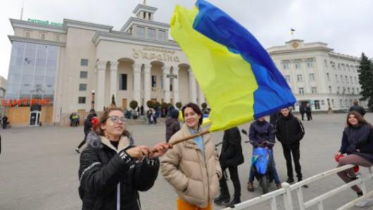 Người dân Kherson vẫy cờ Ukraine. Ảnh Pravda