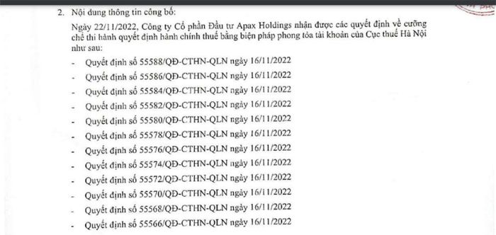 Ngày 23/11, Công ty CP Đầu tư Apax Holdings (mã chứng khoán: IBC) công bố về việc nhận được quyết định cưỡng chế thuế bằng biện pháp phong tỏa tài khoản công ty của Cục Thuế TP. Hà Nội.