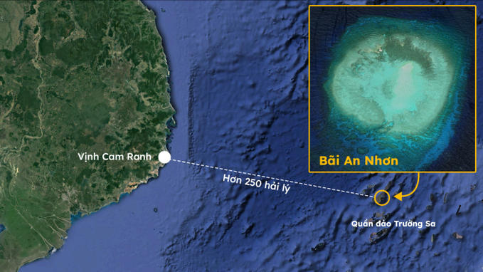 Bãi An Nhơn (quần đảo Trường Sa, Việt Nam) cách vịnh Cam Ranh hơn 250 hải lý (khoảng 450 km). Ảnh: Khánh Hoàng