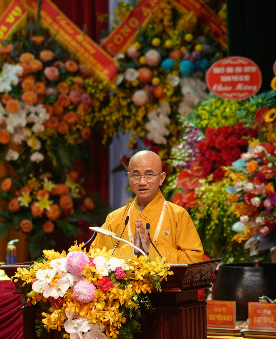 Thượng tọa Thích Đức Thiện đọc tờ trình Hiến chương tu chỉnh lần thứ 7 tại Đại hội Phật giáo toàn quốc 2022. Ảnh: Quảng Tâm.