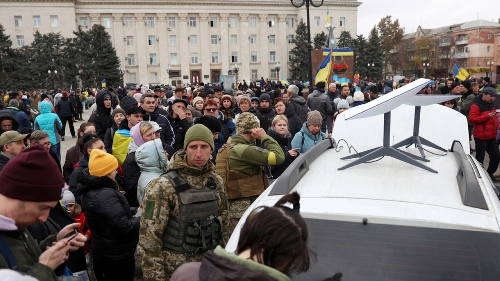 Người dùng Starlink ở Ukraine tập trung xung quanh một nhà ga ở Kherson. Ảnh: AFP