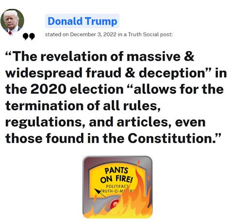 Trump claimed "the revelation of MASSIVE & WIDESPREAD FRAUD & DECEPTION" in the 2020 election "allows for the termination of all rules, regulations, and articles, even those found in the Constitution."