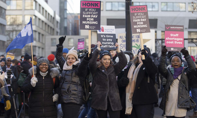 Người tham gia tuần hành giơ biểu ngữ kêu gọi ủng hộ tăng lương cho các y tá bên ngoài bệnh viên St. Thomas ở thủ đô London, Anh ngày 15/12. Ảnh: AFP.