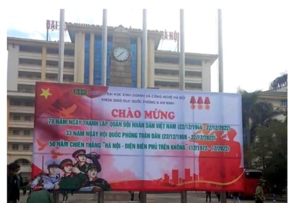 Như Báo Người Lao Động đã thông tin, mạng xã hội ngày 20-12 xôn xao hình ảnh tấm pano ghi tên Trường Đại học Kinh doanh và Công nghệ Hà Nội có in nền cờ Trung Quốc. Trên tấm pano này ghi Khoa Giáo dục, quốc phòng và an ninh chào mừng 78 năm ngày thành lập Quân đội nhân dân Việt Nam (22-12-1944 - 22-12-2022); 33 năm ngày Hội Quốc phòng toàn dân (22-12-1989 - 22-12-2022); 50 năm chiến thắng Hà Nội - Điện Biên Phủ trên không (12-1972 - 12-2022).