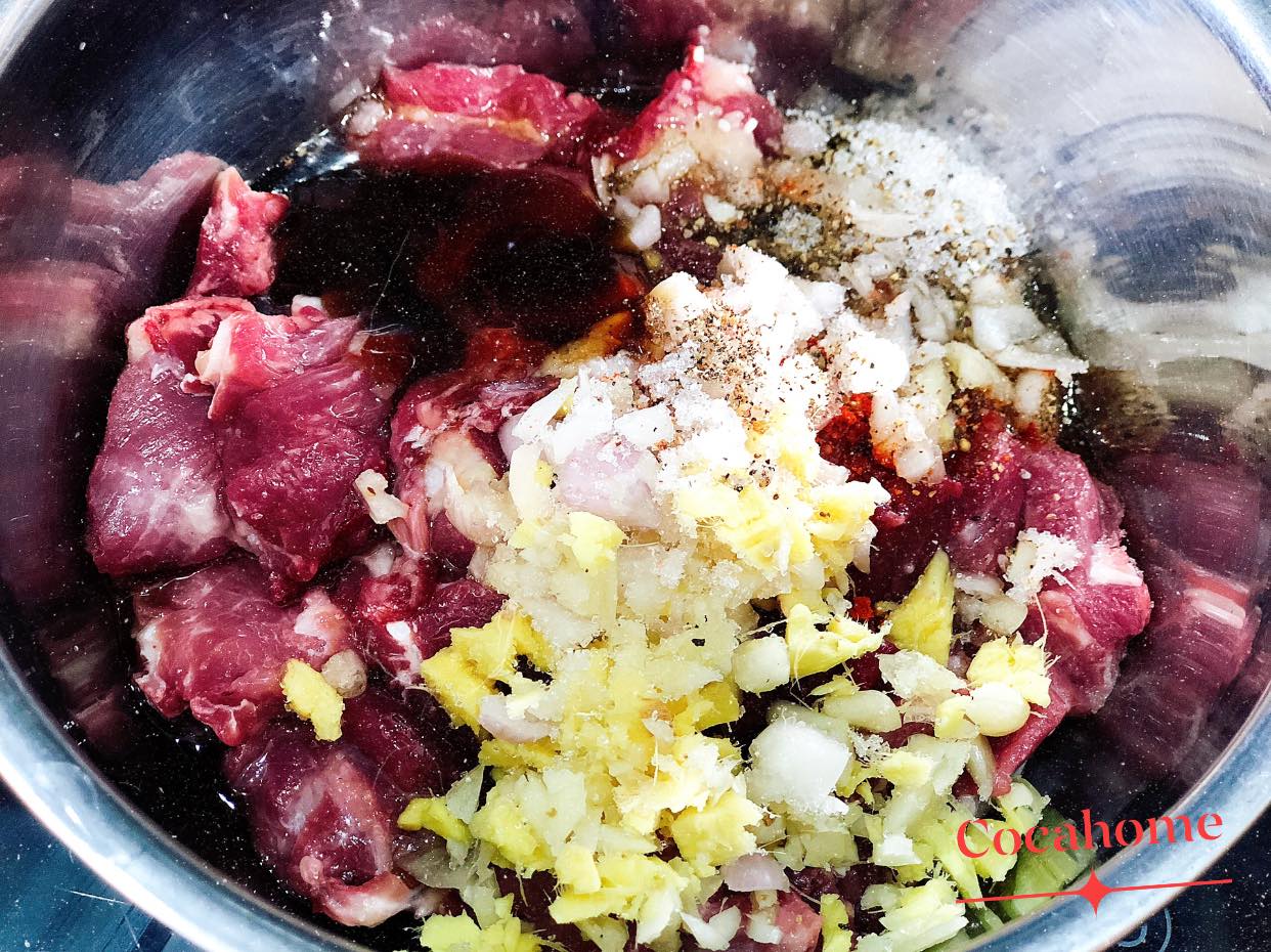 - Ướp thịt bò cùng hành tỏi gừng đã băm cùng nước mắm, đường, dầu hào, gói gia vị sốt vang, màu điều, hạt nêm. Để ngoài 30 phút cho ngấm gia vị vào thịt sau đó để trong ngăn mát tủ lạnh 2-3 tiếng hoặc qua 1 buổi.
