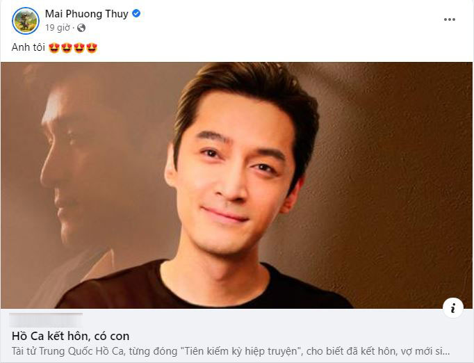 Showbiz Hoa ngữ nói riêng và cả châu Á nói chung trở nên rộn ràng hơn bao giờ hết khi Hồ Ca - người được mệnh danh là "Thánh ế Cbiz" - tuyên bố đã kết hôn và có con. Biết tin này, Hoa hậu Mai Phương Thúy cũng không giấu được sự hào hứng và chia sẻ tin vui về thần tượng trên trang cá nhân.