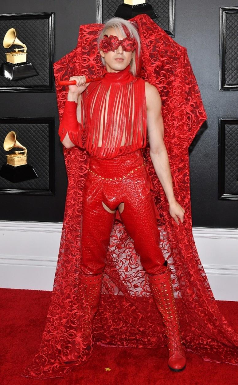 Ricky Rebel dẫn đầu danh sách khách mời mặc xấu nhất Grammy 2020. Anh diện trang phục kỳ quái gồm áo phối tua rua, quần da có chi tiết cut-out tại vị trí nhạy cảm, hở trọn vòng 3, mang boots cổ cao đính đinh tán và cầm chiếc ô ren diêm dúa. Sau phần tạo dáng, nửa thân áo trên của nam nghệ sĩ đã bị rơi ra. Ảnh: CNN.