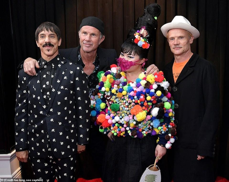 Một thảm họa thời trang là nhân vật gần như vô danh, mặc áo gắn bông, đeo khẩu trang kỳ quặc, chụp ảnh cùng các thành viên Red Hot Chilli Peppers ở Grammy 2019. Ảnh: DM.