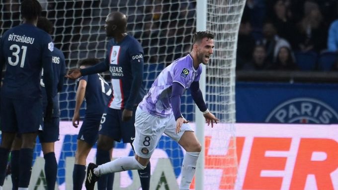 Van Boomen ăn mừng sau khi đưa Toulouse vượt lên dẫn trước PSG.