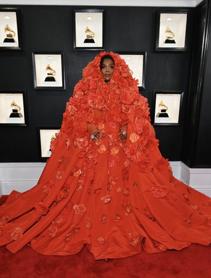 Lizzo phủ đỏ toàn bộ sự kiện với thiết kế trùm đầu đính hoa của Dolce & Gabana, nhiều người phải "oh wow" với diện mạo lần này của nữ ca sĩ 34 tuổi. Bộ cánh được nhấn nhá bằng hai viên kim cương lớn ở tay, phải chăng Lizzo muốn trở thành "nữ hoàng" thực sự tại thảm đỏ?