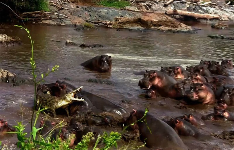 Trong khi đó, con cá sấu đen đủi này lại “ngu ngốc” tới mức “dấn thân” vào giữa cuộc đại chiến giữa các con hà mã.