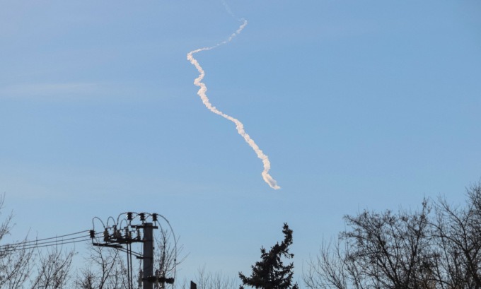 Vệt khói của tên lửa phòng không Ukraine trên bầu trời Kiev hôm 15/2. Ảnh: Reuters.