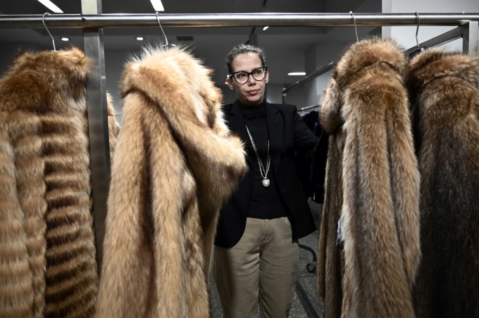 Nhân viên treo áo khoác lông thú trong phòng trưng bày ở thành phố Siatista, miền bắc Hy Lạp, ngày 1/2. Ảnh: AFP