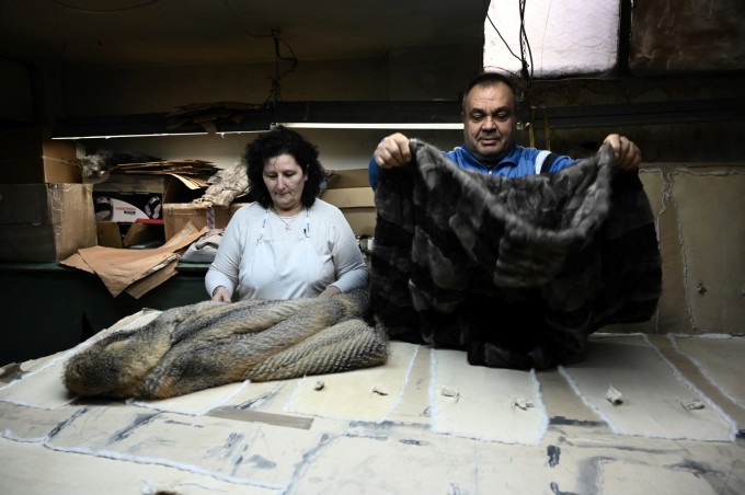 Hai vợ chồng bà Mary, 59 tuổi và ông Kostas Fotis, 67 tuổi, trong xưởng may lông thú ở thành phố Siatista, miền bắc Hy Lạp, ngày 1/2. Ảnh: AFP