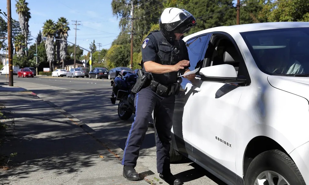Cảnh sát điều khiển xe máy chuyên dụng dừng một phương tiện trên đường ở Santa Rosa, California, Mỹ, hồi năm 2019. Ảnh: AP.