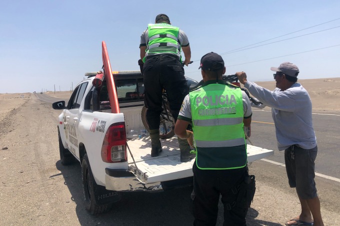CSGT ở Peru giúp đỡ Hương khi chiếc xe máy bị thủng săm trên cao tốc.
