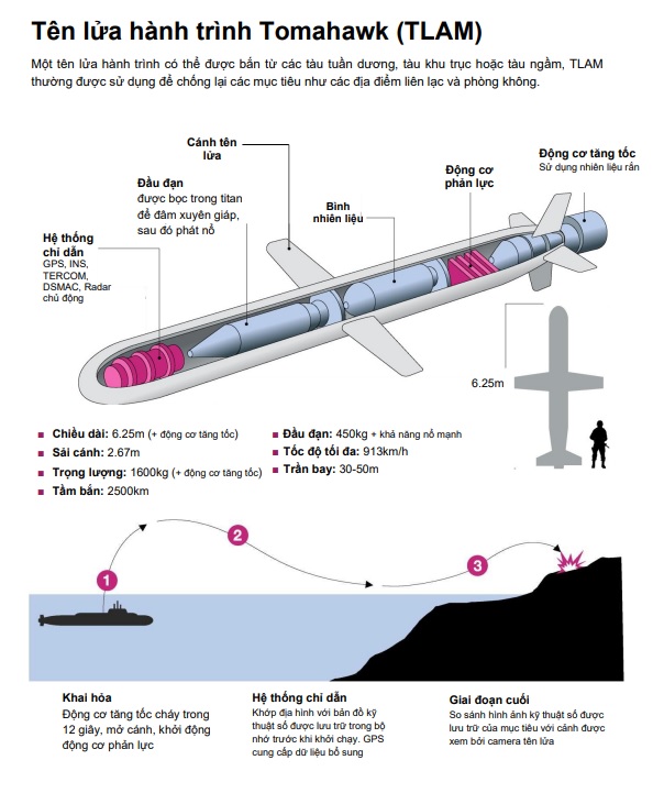 Kết cấu tên lửa hành trình Tomahawk. (Nguồn: Encyclopedia Britannica, CIA World Factbook, Reuters)