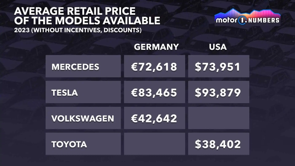 Giá bán lẻ trung bình của Tesla vượt trội Toyota, Volkswagen và cao hơn cả Mercedes tại các thị trường Mỹ, châu Âu. Ảnh: Motor1.