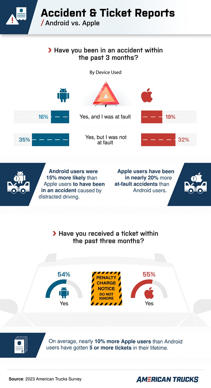 Theo khảo sát, người dùng Android không nhắn tin nhiều như người dùng iPhone khi lái xe. Biên độ phần trăm của cuộc khảo sát này chỉ là 2%. Cuộc khảo sát đã chứng minh rằng người dùng iPhone có nhiều khả năng là nguyên nhân gây ra tai nạn hơn người dùng Android. Người dùng iPhone là nguyên nhân gây ra 20% các vụ tai nạn trong khi người dùng Android ghi nhận 15% các vụ tai nạn do mất tập trung.