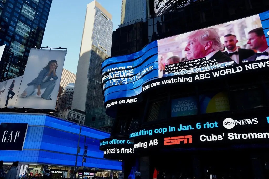 Tin tức về ông Trump trên Quảng trường Thời đại hôm 30/3. Ảnh: New York Times.