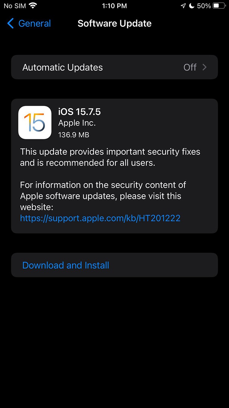 Người dùng có thể cập nhật iPhone của mình lên iOS 15.7.5 (và iPadOS 15.7.5) bằng cách đi tới ứng dụng Cài đặt, chọn Cài đặt chung, sau đó chọn Cập nhật phần mềm. Số bản dựng cho bản cập nhật mới là 19H332 và có sẵn cho tất cả các kiểu iPhone 6s và 7, cũng như iPhone SE thế hệ 1, iPad Air 2, iPad mini thế hệ 4 và iPod touch thế hệ 7.
