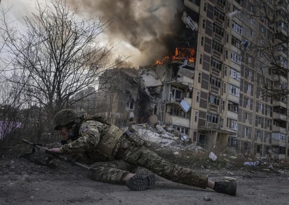 Một binh sĩ Ukraine ẩn nấp trước tòa nhà bốc cháy và đổ nát ở Avdiivka. Ảnh: AP
