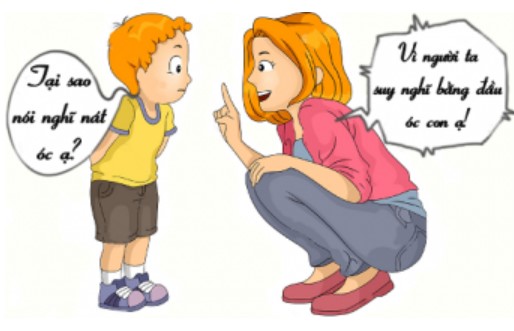 - Hôm qua lúc nói chuyện với bố, mẹ bảo 'tôi nghĩ bụng...' - Tý gãi đầu - Vậy hóa ra mẹ suy nghĩ bằng bụng à?