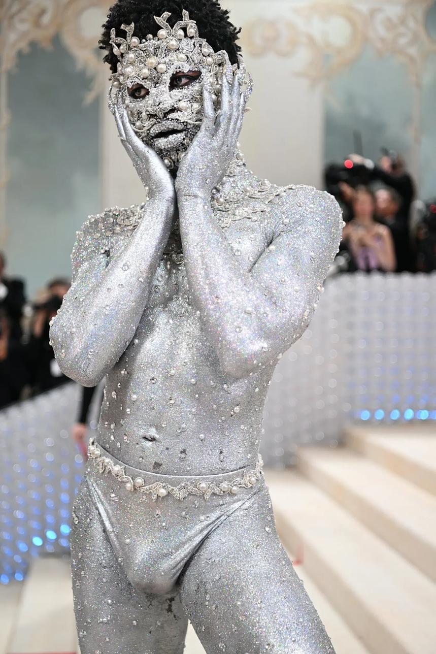 Tại Met Gala 2023 diễn ra ngày 1/5, Lil Nas X trở thành tâm điểm trên thảm đỏ khi diện trang phục phá vỡ quy chuẩn thông thường. Chủ nhân bản hit Old Town Road xuất hiện trong chiếc quần lót chữ G ánh kim cũng như phủ kín người bằng 218.787 viên pha lê Swarovski cùng nhiều viên ngọc trai khác.