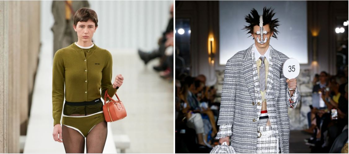 Trang phục biến tấu quần lót thành item mặc ngoài của thương hiệu Miu Miu (trái) và Thom Browne. Ảnh: Vogue.