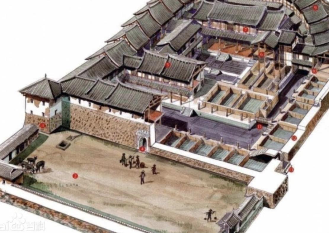 Bên trong tòa nhà gồm 360 gian phòng, 12 phòng bếp, 5 giếng nước, có thể phục vụ cùng lúc 1.000 người sinh sống. Tường thành cao hơn 10 mét, sử dụng gần 10.000 tấn đá, nằm trên đầm lầy nhưng không hề sụt lún. Bí quyết ở phần móng được đắp bằng gỗ thông đã phơi khô và ngâm qua nước. Gỗ thông sau khi phơi và ngâm, trở nên rắn chắc, tác dụng chống mối mọt.