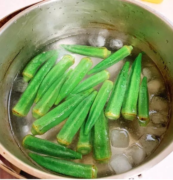 Thả đậu bắp vào bát nước đá lạnh để làm nguội. Như vậy, đậu bắp sẽ không bị chín quá và vẫn giữ được màu xanh đẹp mắt.