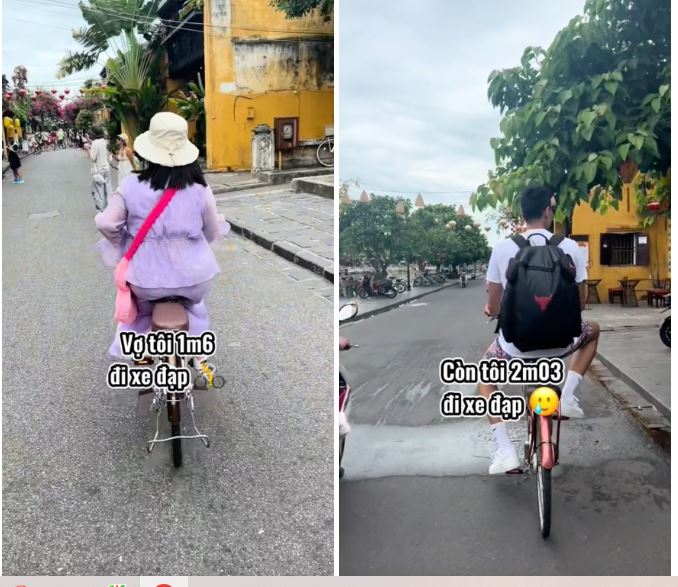 Trong clip được Phú Vinh đăng tải, anh chàng quay vợ đi xe đạp với góc nhìn từ trên xuống, trông rất nhỏ nhắn dễ thương. Ngược lại khi Thúy Uyên quay chồng thì phải hướng camera lên phía trên vì anh chàng quá cao. Cũng vì chiều cao và đôi chân quá dài mà vóc dáng đi xe đạp của Phú Vinh khá buồn cười.