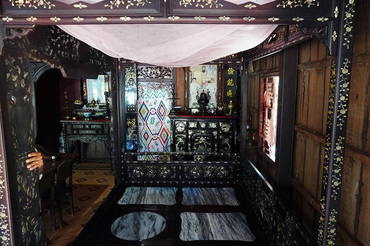 Long sàng mà ông đang sở hữu cao khoảng 2,5m, rộng gần 2m, màu nâu đen, toát lên vẻ sang trọng. Toàn bộ giường được làm bằng gỗ quý, khảm xà cừ với nhiều hoa văn tinh xảo.