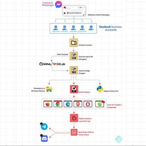 Một nghiên cứu mới của Guardio Labs cho biết, chiến dịch do nhóm hacker gốc Việt thực hiện, sử dụng một file nén nhỏ đính kèm, chứa công cụ đánh cắp dựa trên Python cùng các phương pháp ‘ẩn náu’ đơn giản nhưng hiệu quả.Theo sơ đồ minh họa, hacker gửi và dụ dỗ nạn nhân mở những file nén zip hoặc rar qua Facebook Messenger. Sau khi được thực thi, mã độc sẽ tải các mã phá hoại từ Github về và ăn trộm các cookie, từ đó chiếm đoạt các tài khoản internet như tài khoản mạng xã hội, email... Sau khi chiếm đoạt các tài khoản này, đặc biệt là tài khoản Facebook, hacker có thể tiếp tục sử dụng nick của nạn nhân để chat với bạn bè trong danh sách để tiếp tục lan truyền mã độc.