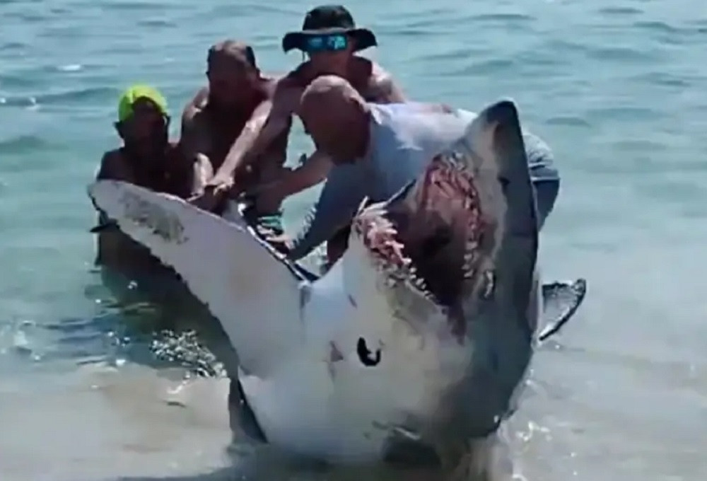 Con cá mập sau một lúc vùng vẫy đã thấm mệt, nên một người đàn ông đội mũ xanh có thể nắm lấy phần đuôi và đưa nó xuống mặt nước. Đến khi toàn bộ thân con cá mập chìm trong nước, anh này mới buông tay và để nó bơi ra biển.