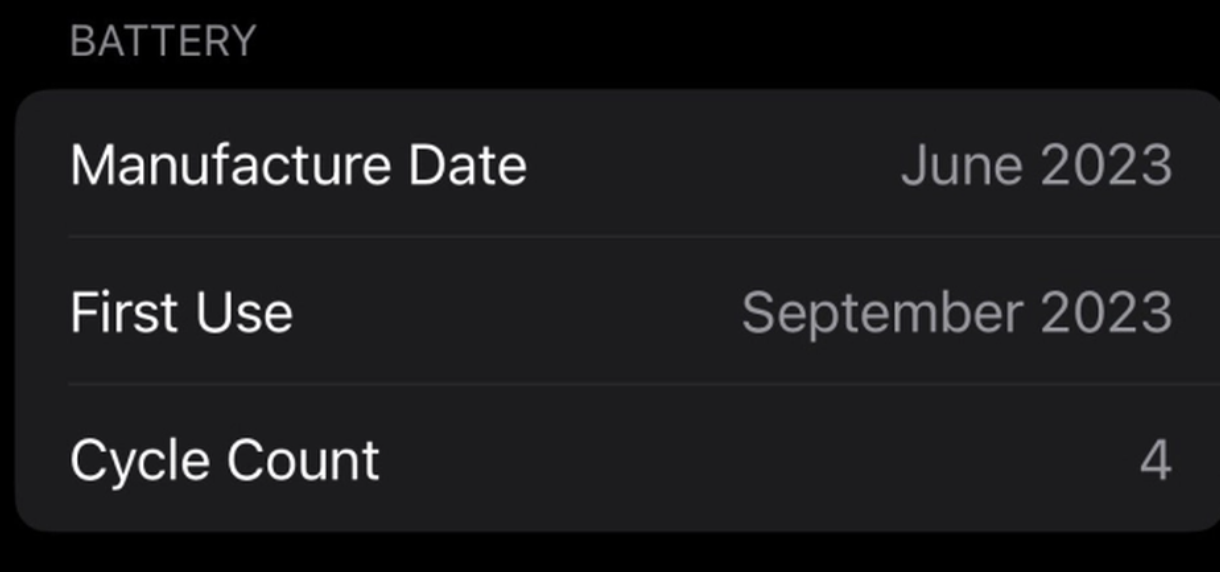 Thông qua cài đặt mới, người dùng có thể kiểm tra ngày sản xuất, thời gian sử dụng ban đầu và số chu kỳ của iPhone 15 mới rất dễ dàng. Đáng nói hơn, điều này chỉ có trên mẫu iPhone 15 mới và kể cả iPhone 14 Pro Max cũng không có cài đặt này.