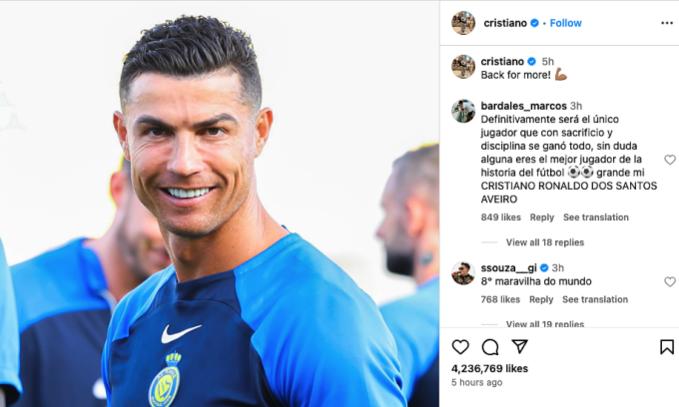 Trên Instagram, Ronaldo đăng ảnh chụp trong màu áo Al Nassr. Anh viết: "Trở lại để chinh phục nhiều hơn!", kèm biểu tượng gồng bắp tay.