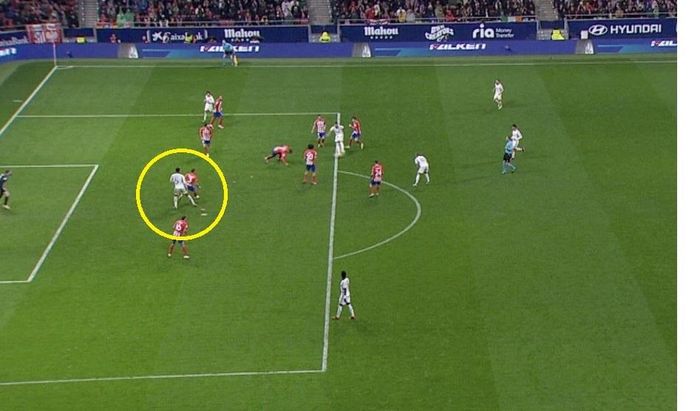 Đây là quyết định gây tranh cãi của tổ trọng tài, bởi bóng chạm vào một cầu thủ của Atletico rồi mới nảy ra vị trí của Bellingham. Cầu thủ Real phản ứng nhưng không thể thay đổi quyết định của ông Guillermo Cuadra.