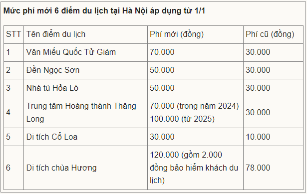 Theo Sở du lịch Hà Nội, 6 điểm du lịch áp dụng tăng phí từ 1/1 gồm Văn Miếu Quốc Tử Giám, đền Ngọc Sơn, nhà tù Hỏa Lò, Hoàng thành Thăng Long, di tích Cổ Loa, chùa Hương. Việc tăng đã được Hội đồng Nhân dân thành phố Hà Nội thông qua tại kỳ họp tháng 12/2023.