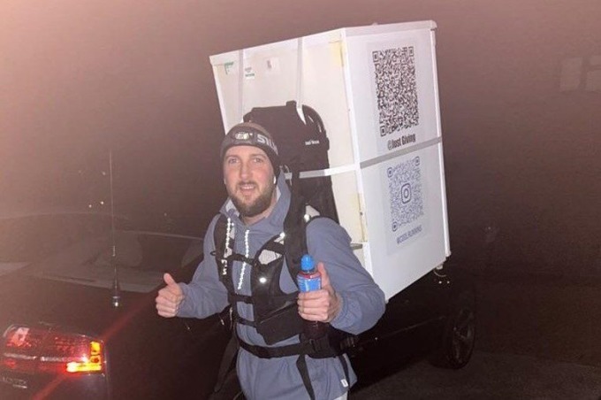 Fairbrother trong một buổi tập chạy với chiếc tủ lạnh cỡ nhỏ trên lưng. Ảnh: Instagram / c00lrunnins