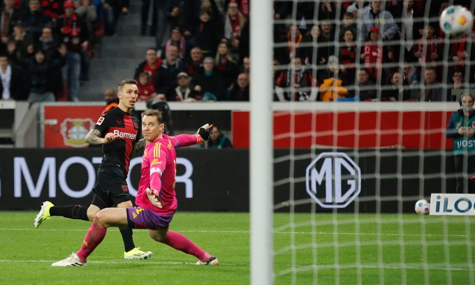 Grimaldo đánh bại Neuer trong tình huống nâng tỷ số lên 2-0 cho Leverkusen. Ảnh: Reuters