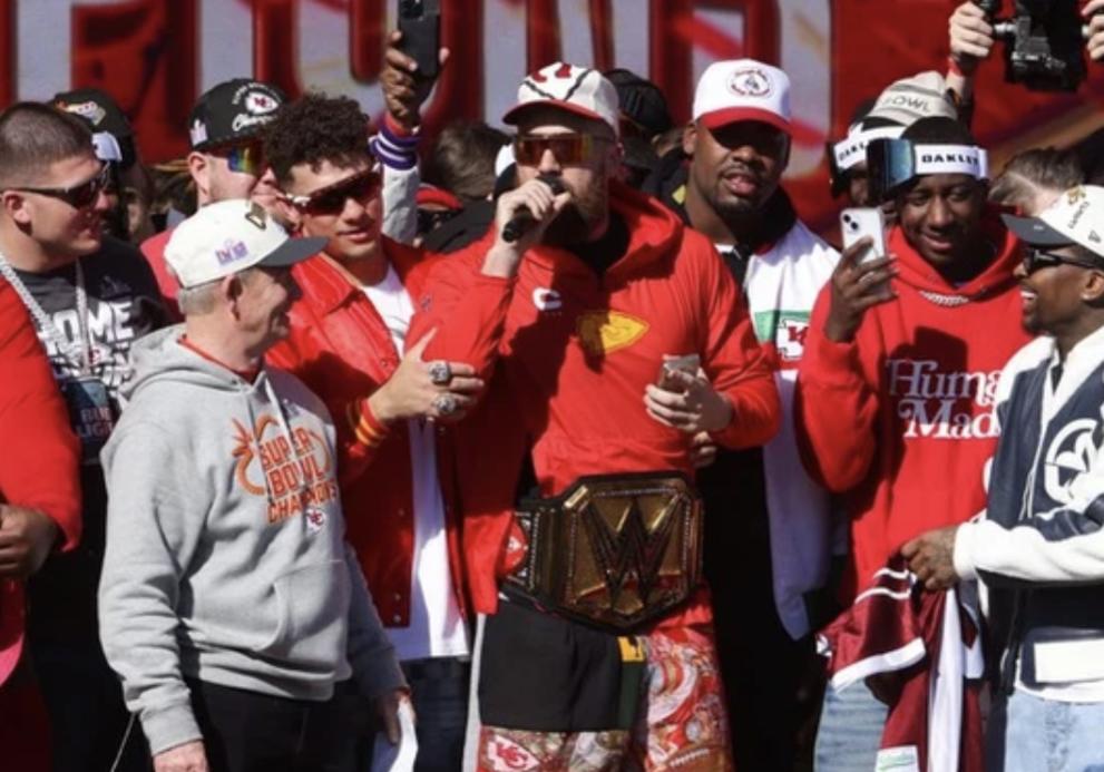 Tuy nhiên, bầu không khí vui vẻ, sôi động bỗng chốc trở nên hỗn loạn ngay khi Travis Kelce và đồng đội Patrick Mahomes vừa tuyên bố giành chức vô địch NFL trên sân khấu.
