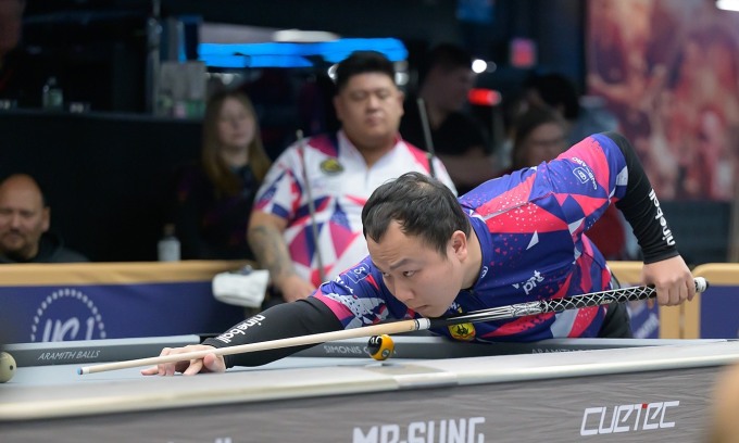 Nguyễn Anh Tuấn trong ván thắng Mario He tại pool 9 bi Ngoại hạng ở thành phố West Haven, bang Connecticut, Mỹ tối 22/3/2024. Ảnh: Matchroom